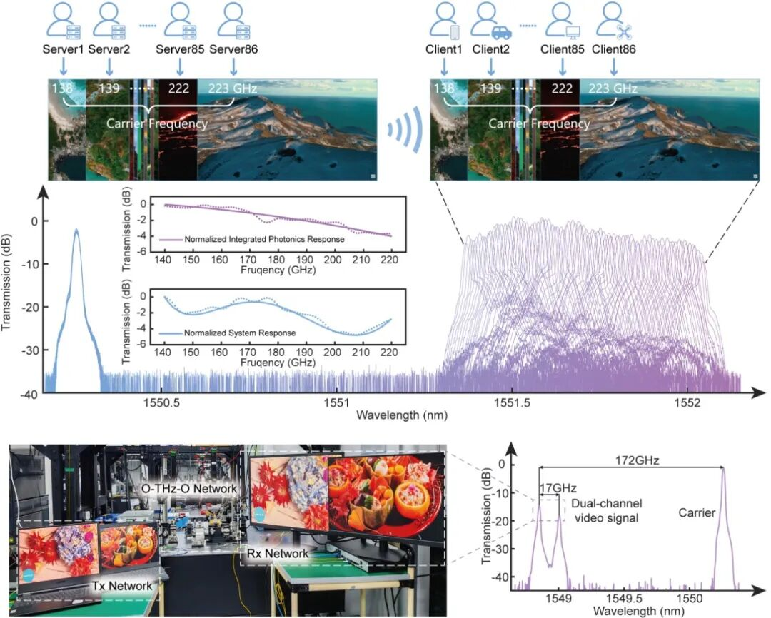 此外,研究团队还模拟了6G大规模用户接入场景,实现86个信道的多路实时8K视频接入演示,传输带宽相较目前5G标准提升一个数量级。得益于核心器件的超宽带平坦频率响应,所有信道均呈现出高度的性能一致性,展现出该系统优越的多用户支持能力。这一突破性成果为6G通信高密度开发太赫兹频谱资源展示出一条全新的解决方案。