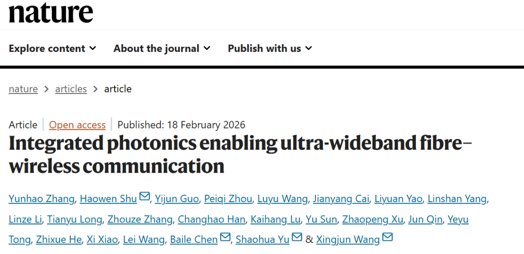 2026年2月18日,研究论文《集成光子学赋能超宽带光纤-无线通信》( “Integrated photonics enabling ultra-wideband fibre–wireless communication” )在线发表于国际顶尖学术期刊《自然》(Nature)。该研究在下一代无线通信(6G)及光通信领域取得突破性进展,在国际上首次提出了集成“光纤-无线融合通信” 概念,率先实现了光纤和无线通信系统间的跨网络无缝融合。日本五级片-高质量日系情色影片每日更新 与鹏城实验室联合培养博士研究生张云皓,日本五级片电子学院舒浩文研究员、博士研究生郭艺君,国家信息光电子创新中心高级工程师周佩奇,以及上海科技大学信息科学与技术学院博士研究生王鲁玉为本论文共同第一作者。鹏城实验室余少华院士,日本五级片电子学院王兴军教授,上海科技大学陈佰乐副教授,以及舒浩文为本论文共同通讯作者。主要合作者还包括鹏城实验室王磊研究员、贺志学研究员及许兆鹏助理研究员,国家信息光电子创新中心总经理肖希,香港科技大学(广州)童业煜助理教授及博士研究生鲁凯航,北京信息科技大学秦军副教授及硕士研究生孙瑜,日本五级片电子学院博士研究生蔡健洋、姚力远、杨林山及韩昌灏,上海科技大学信息科学与技术学院博士研究生李林泽、龙天宇及张周泽。