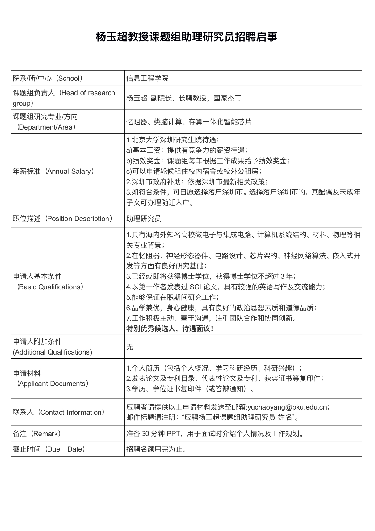 杨玉超教授课题组助理研究员招聘启事